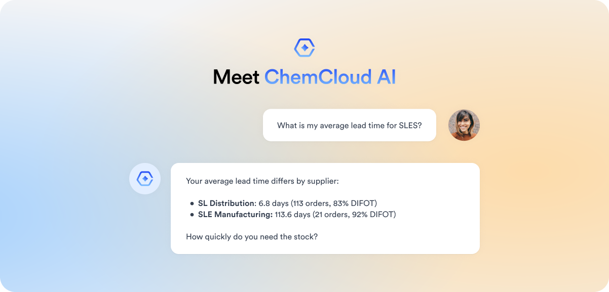 That's exactly what ChemCloud AI Chat delivers. It's a conversational AI layer built on top of your ChemCloud procurement data, designed for the people who actually need the answers: procurement managers, QA teams, and supply chain leads.